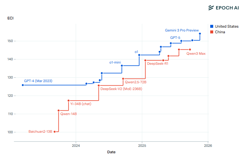 Streudiagramm zeigt die Entwicklung der KI-Modellfähigkeiten von 2023 bis 2025 anhand des Epoch AI Capabilities Index. Geschlossene Modelle (graue Punkte) liegen durchgehend an der Spitze. Open-Weight-Modelle aus China (pinke Dreiecke) holen ab Mitte 2024 deutlich auf und erreichen Ende 2025 nahezu das Niveau der führenden geschlossenen Modelle. US-Open-Weight-Modelle (blaue Quadrate) entwickeln sich parallel, bleiben aber leicht hinter China zurück.