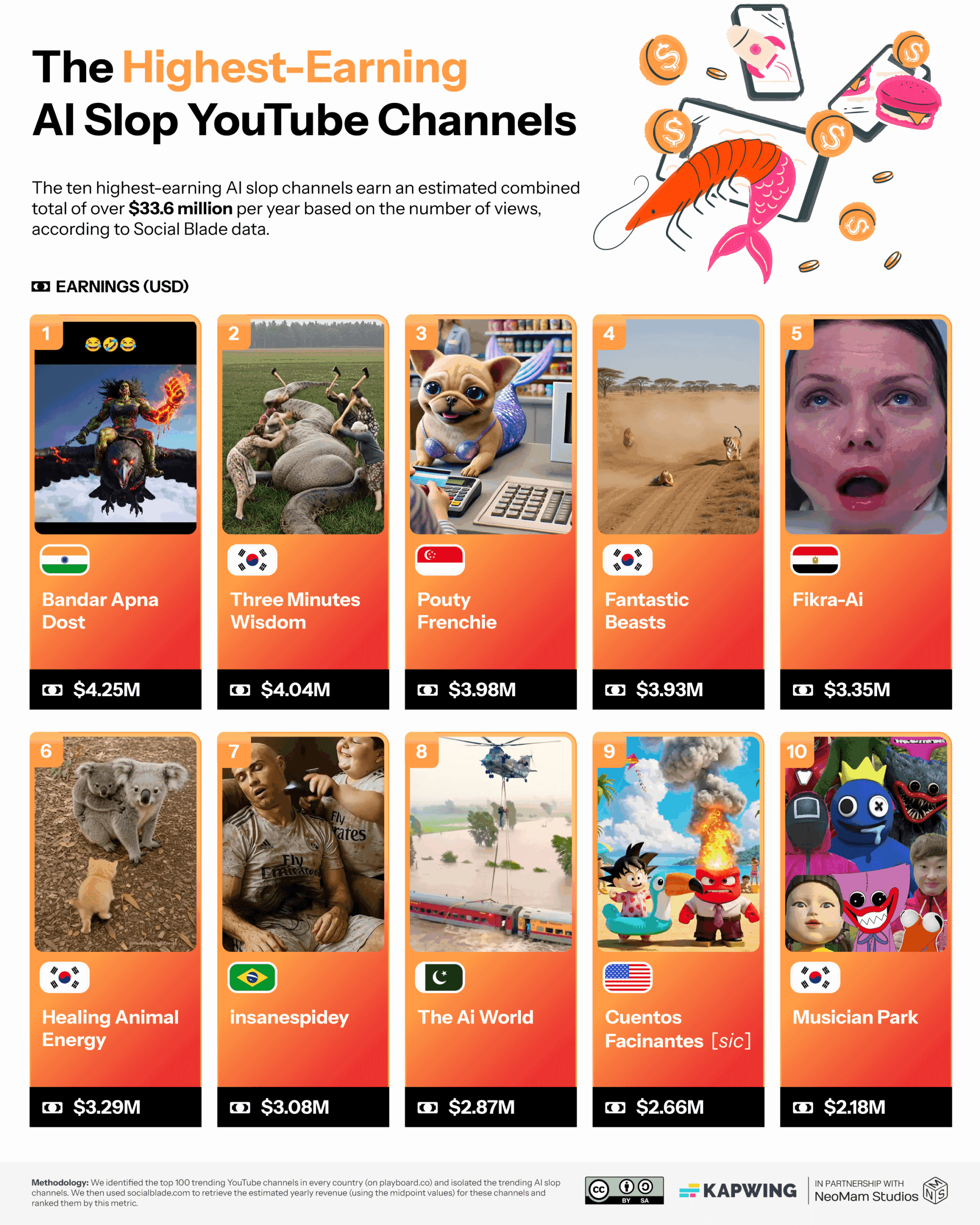 Ob diese Häufigkeit das Ergebnis von YouTubes Algorithmus ist oder schlicht die Menge hochgeladener Slop-Videos widerspiegelt, kann laut Kapwing nur Google selbst beantworten. Eine Analyse des Guardian aus dem August ergab, dass fast jeder zehnte der am schnellsten wachsenden YouTube-Kanäle weltweit ausschließlich KI-generierte Inhalte zeigt.