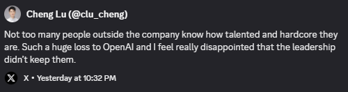 In einem mittlerweile gelöschten Tweet äußert sich der OpenAI-Entwickler Cheng Lu enttäuscht über den Abgang der Kollegen, der ein "großer Verlust" sei.